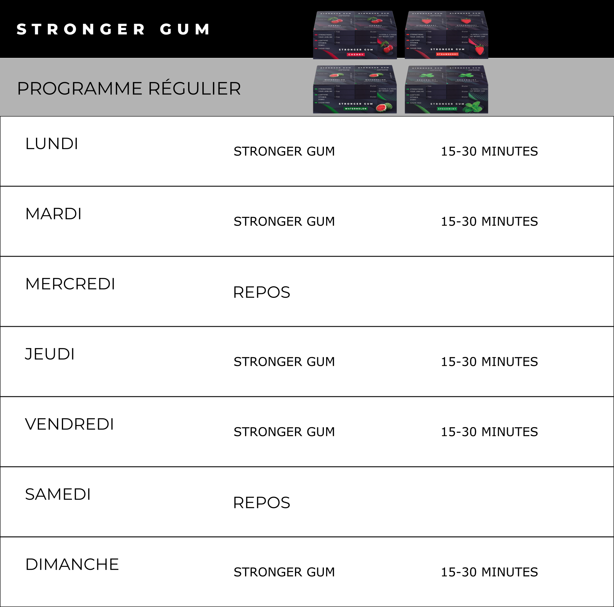 Stronger Gum Très Résistant soumet les muscles et les os de la mâchoire à des forces de broyage plus intenses, ce qui favorise la croissance de nouveaux tissus osseux et musculaires. Il contient une dose plus élevée de vitamines D3 et K2 qui contribuent à ce processus en étant absorbées directement dans les tissus buccaux. Il n'utilise que du xylitol comme édulcorant qui se combine avec l'arôme naturel de menthe verte.